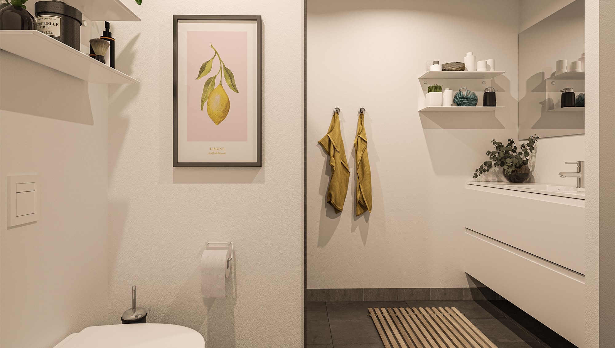 Badeværelset er rummeligt med væghængt toilet, vaskesøjle og håndvask med integreret underskab, så du har dine ting lige ved hånden. Og så har brusekabinen glasdør, så lyset kommer uhindret ind, og rummet virker større.