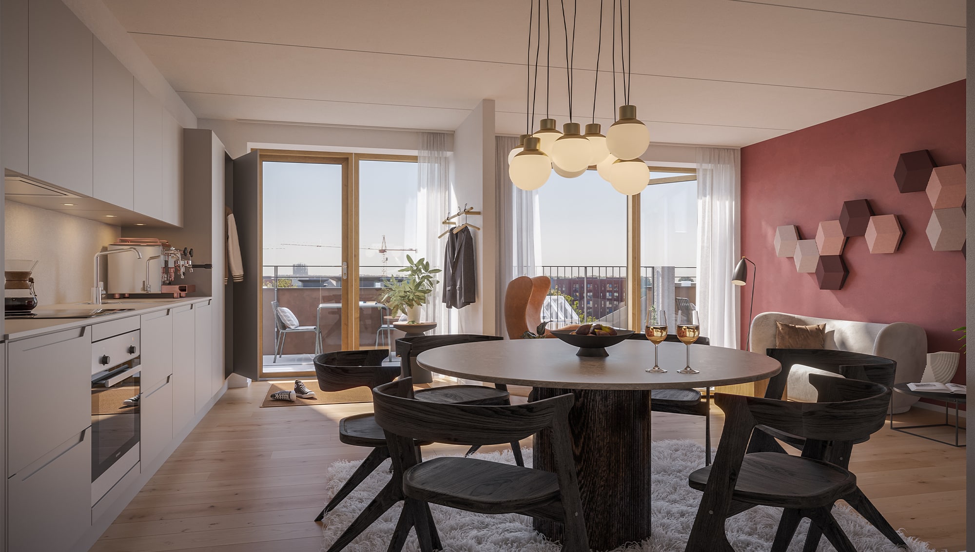 Det her er stedet til dig, der vil bo i et DGNB-certificeret byggeri midt i Aarhus. Til dig, der vil have plads til både eventyr og fællesskab på en helt almindelig onsdag. Og til jer, der drømmer om, at børnene trygt kan lege i gården med nabobørnene, om loungehygge på tagterrassen og fællesspisning med vennerne.